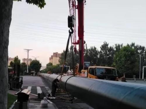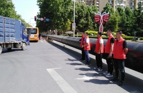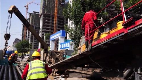 從4月15日至5月29日,兩臺大型擴(kuò)孔機沿著設(shè)計線路切削地層,不斷前進(jìn)。每鉆完一根鉆桿,技術(shù)人員都要測量核對一次鉆頭實際位置,及時調(diào)整鉆進(jìn)方向,保證導(dǎo)向孔曲線符合設(shè)計要求。經(jīng)過施工人員日夜奮戰(zhàn),南段擴(kuò)孔完成。與此同時,水興市政公司對134根12米長度的鋼管進(jìn)行焊接,對133個電熔焊口全部進(jìn)行射線無損探傷,并對焊接處進(jìn)行內(nèi)外防腐處理,確保焊口100%合格。5月28日20:00,南段工程進(jìn)行第二階段回拖布管施工,施工人員整裝以待,十幾臺重型吊車來回穿梭吊裝管道,水興市政18名黨員志愿者現(xiàn)場協(xié)助指揮交通,疏導(dǎo)行人和車輛。晚10:00,隨著鉆機的巨大的轟鳴聲,792米DN1020的鋼管在24個滑輪組的支托下,宛若一條蜿蜒的巨龍緩緩鉆入地下。歷經(jīng)22小時30分鐘,在全場40余名工作人員的配合努力下,南段792米鋼管順利完成定向穿越。