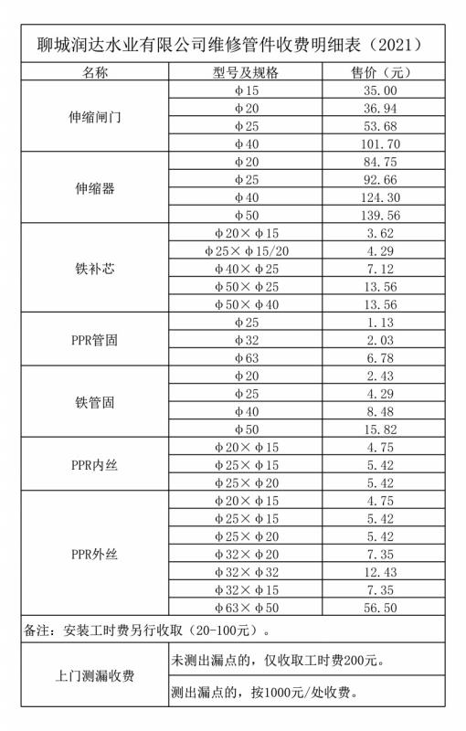 供水價(jià)格明細(xì)表