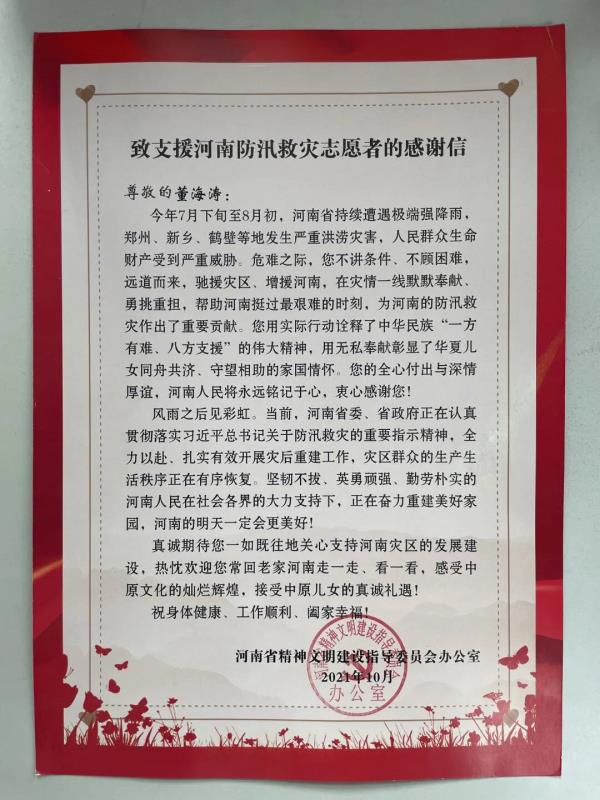 12月17日,一封來(lái)自河南省精神文明建設(shè)指導(dǎo)委員會(huì)的感謝信送到集團(tuán),向員工董海濤同志致以最真摯的感謝和贊許!