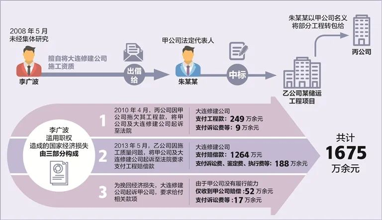 國有公司人員濫用職權(quán)罪。2008年,李廣波在擔(dān)任大連修建公司總經(jīng)理期間,違法出借公司施工資質(zhì),濫用職權(quán)給國有公司造成損失共計(jì)1675萬余元人民幣(幣種下同)。